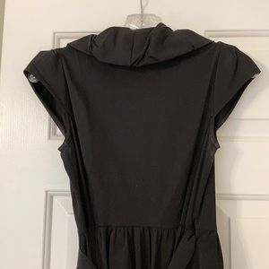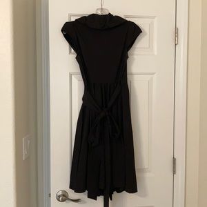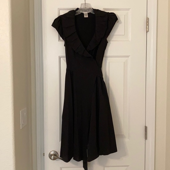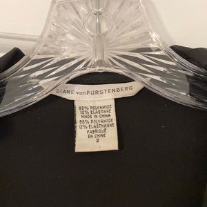 Classic DVF wrap dress. The dress is black with an elegant ‘ruffle’ around neck line. The top is a low v cut, the cap sleeves have a subtle pleated detail. The dress comes to just below the knees.