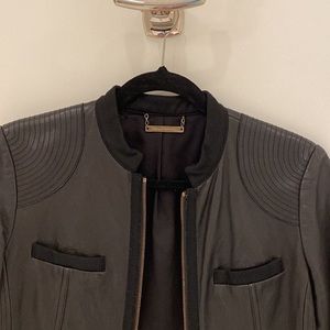DVF black leather moto jacket w/zipper details at sleeves & back of jacket. Size 6.