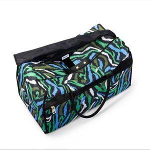 This Disco Zebra Weekender Bag from Diane von Furstenberg for Target makes it easy to neatly pack away all your things for vacations, staycations and trips to a friend's. Designed with disco zebra green pattern, this unstructured bag has a spacious main compartment that closes with a zipper and double-snap closure to keep your things secured yet close at hand. With interior zip and cell phone pockets plus an exterior zip pocket, you'll have plenty of storage space, and double handles make it easy to carry around.