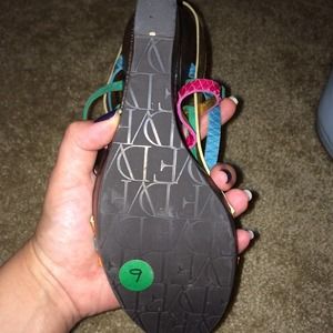 NWOT. Never worn outside the house. High wooden platform and funky multicolor cross straps in suede and snakeskin. Festive and gorgeous. Squishy sole for comfort.