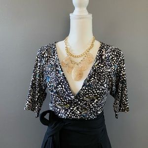 Black bottom and print top wrap dress Wide black waist with wide tie Like new