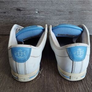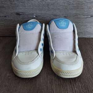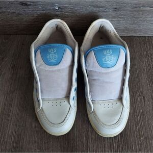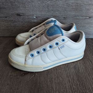 DVS sneakers feature a sleek white upper with light blue accents, offering a fresh and modern look. The ribbed side panels and classic low-top silhouette add a touch of style, while the durable rubber toe cap ensures lasting wear.