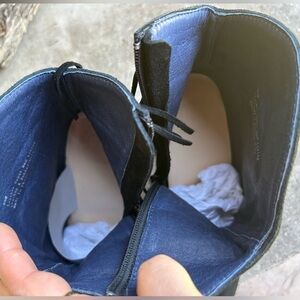 Black upper & lining leather booties w/rubber sole & inner/zipper. Cute fun/fringe boots for dancing in. Pre owned in excellent like new condition. Dark black like last pic.