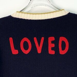 This luxurious Gucci cardigan, crafted in Italy, features a navy wool body with contrasting ivory trim and red accents. The back showcases a bold "Loved" detail, combining sophistication with a statement design. Ideal for layering during cooler months, this piece exemplifies timeless elegance and premium craftsmanship.