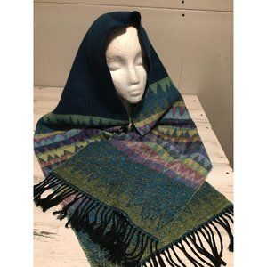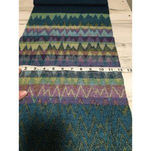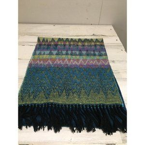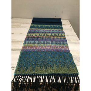 green blue yellow 12”x68” geometric patterned scarf with black fringe. Hand wash, reshape flat. Good pre-owned condition.