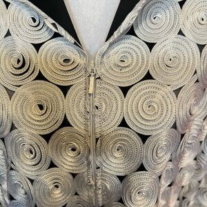 The D&Y NWT Evening Jacket in size 1X is a stylish and versatile outerwear piece for women. Made from a luxurious blend of rayon and nylon, this jacket features a black and white spiral design, long sleeves, and a full zip closure. The applique accents and floral pattern add a touch of elegance, making it suitable for formal occasions or parties. The mesh fabric type and nylon lining ensure comfort and breathability, while the plus size fit caters to various body types. This jacket is a must-have for any wardrobe, perfect for all seasons and adding a pop of color to your outfit.