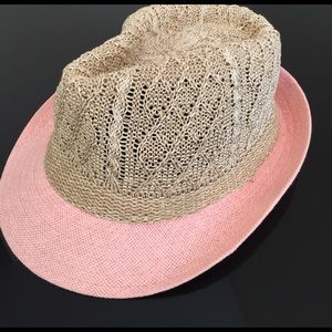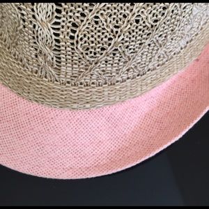 Super trendy and shake straw firm material beige and baby pink fedora hat. Company is D&Y. Perfect for the fall spring and summer weather take it on vacation with you.