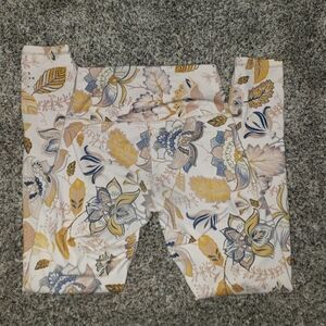 Stylish leggings with a vibrant floral pattern. Features shades of blue, yellow, and cream.
