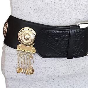 DYLANLEX Romy black leather wide belt features a high-waist fit and bold medallion charm details. This statement accessory exudes edgy sophistication with luxe craftsmanship. Perfect for elevating any look, it adds dramatic flair and modern glam to both casual and dressy outfits.