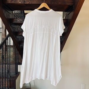 Chic white dress with floral embroidery. The asymmetrical hemline at the bottom makes for a unique fit. I’ve worn this as a dress and also as a long blouse over a white/ blue linen long skirt. Could be a quick beautiful suit coverup in the summer months as well.