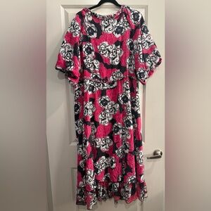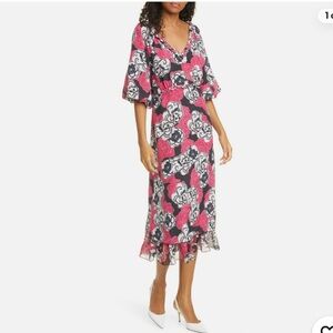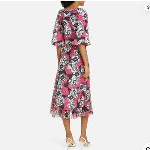 This elegant pink sundress features a sleeveless design with flutter sleeves and a classic crew neck. Its midi length and vibrant floral pattern make it perfect for weddings, cocktail parties, or resort wear. The flowing silhouette and luxurious fabric ensure comfort and style for any occasion.