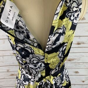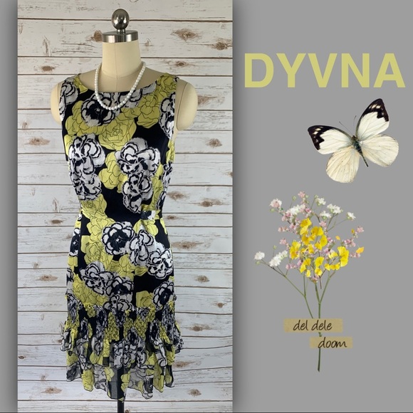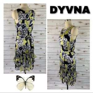 DYVNA Yellow Black Chacha Ruffle Floral Silk Dress