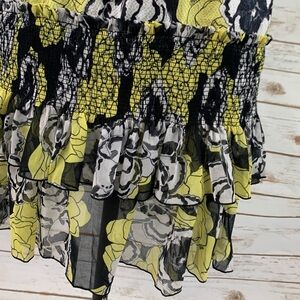 DYVNA Chacha Ruffle black and yellow Floral Silk Dress Tiered chiffon ruffles add a flirtatious note to a party-ready dress in a fitted A-line cut of lightly textured silk #1133