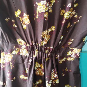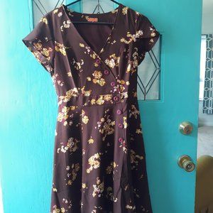Dark Burgandy Modcloth dress with pale yellow and cream flowers. Lovely button detail .1940's style. Never worn or laundered. 18 inches armpit to armpit. 15 inches across waist. 100 % polyester. Size Medium.