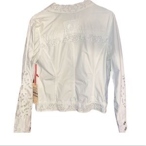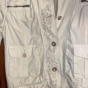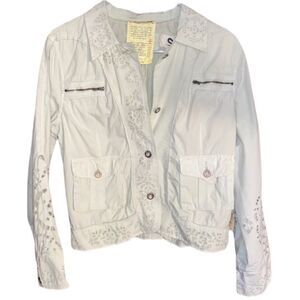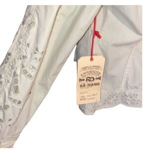 Vintage-inspired and full of personality, this Da-Nang Surplus Indo-Chine jacket is a rare find! Featuring beautiful tonal embroidery on the front, back, collar, and sleeves, this light cream-colored utility jacket is both edgy and feminine. With a button front, flap and zip pockets, and soft cotton blend fabric, it’s perfect for layering year-round. Size Small. Excellent condition with original tags still attached!