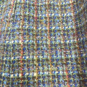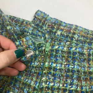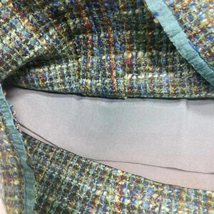 Davido 1960’s vintage a-line skirt with peeled hem. Lining is a light emerald green. The tweed skirt is emerald green with hints of yellow, orange and brown. Versatile.