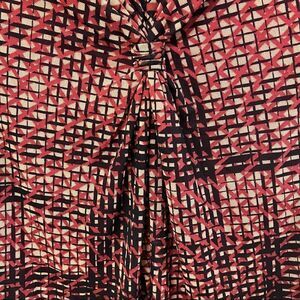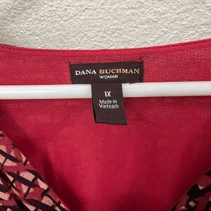 This great pattern short sleeve v-neck top is from Dana Buchman. The item has red lining. The front has a stylish knot up front. The shell is made out of 100% nylon. The lining is 100% polyester. The size is 1X. The measurements are 25” L x 24” W (pit to pit) x 9” sleeve (shoulder to cuff). This top has been gently worn but is in very good condition.