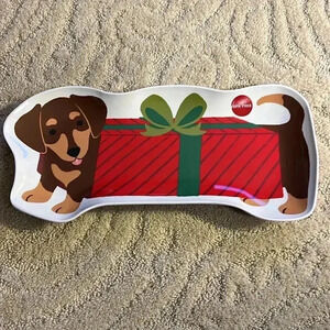 Super cute dachshund serving tray. Perfect to use as a hostess gift filled with cookies or for your own home. See pictures for details. The light reflects off the tray and shows in the pictures.