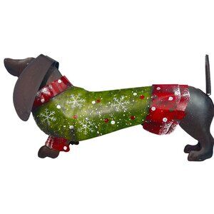 A charming dachshund sculpture with festive details, perfect as a holiday decor piece. Green sweater with snowflakes and red accents add seasonal cheer year around.