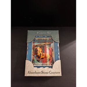 Absorbent stone coasters, set of 4. Dachshund World Class Frankfurters is the graphic on them. Excellent unused condition, in original box. 5" x 3 3/4" is the size of the coaster.
