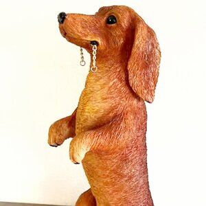 Wonderfully crafted with great detail will bring delight to your home. This Golden-Brown Dachshund is made of ceramic, stands 14 inches tall, has to small chains hanging from his mouth to add your own crafted "welcome" or other type sign, or the chains can be removed with wire snippers (not included). This dachshund will sit proudly in your home or outside porch or steps. If kept outside please bring him in during inclement weather and do not place in direct sunlight. The little guy is not a toy or intended for play with children. He comes in his original box, has never graced any home (new) and has a Certificate of Authenticity. His Certificate is numbered.