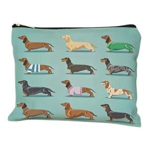 Cute dachshund-themed zipper pouch featuring illustrated dachshunds in a variety of coat colors and outfits on a soft teal background. Rectangular zip-top design makes it ideal for use as a cosmetic bag, pencil pouch, or small organizer. Lightweight and easy to toss into a handbag or tote, with a playful design perfect for dog lovers and dachshund enthusiasts.