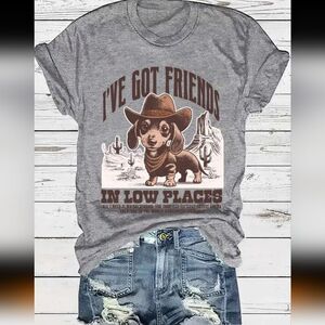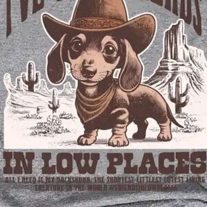 This stylish gray T-shirt features a charming western Dachsund dog graphic, perfect for pet lovers. Comfortable and trendy, it's a great addition to any casual wardrobe.