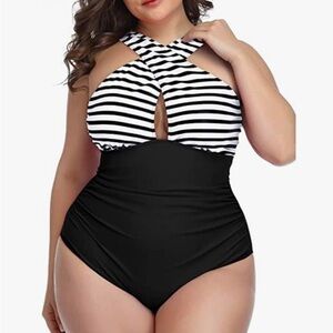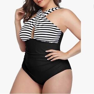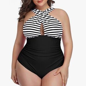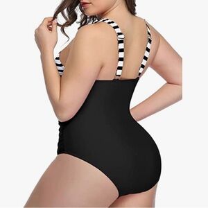 Daci Black & White Stripe Front Cross One Piece Flattering Tummy Coverage 22W