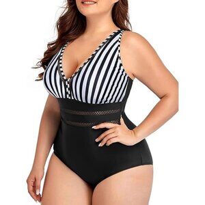 plus size swimwear, Daci swimsuit, tummy control, one-piece swimsuit, adjustable straps, padded bra, v-neck swimwear, striped swimsuit, hollow-out style, beachwear, women's swimwear, full coverage, swim fashion