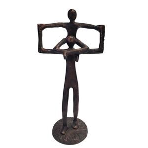 The product is a 15" tall figurine depicting a dad and son sculpture, designed in an iron metal material with a brown/black color finish. The brutalist style sculpture captures the theme of family, making it suitable for all occasions and adult audiences. With a medium size and distinctive subject of a father, this figurine would make a unique and meaningful addition to any collection or decor.