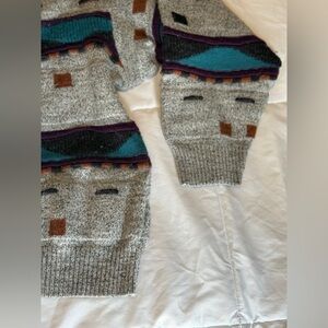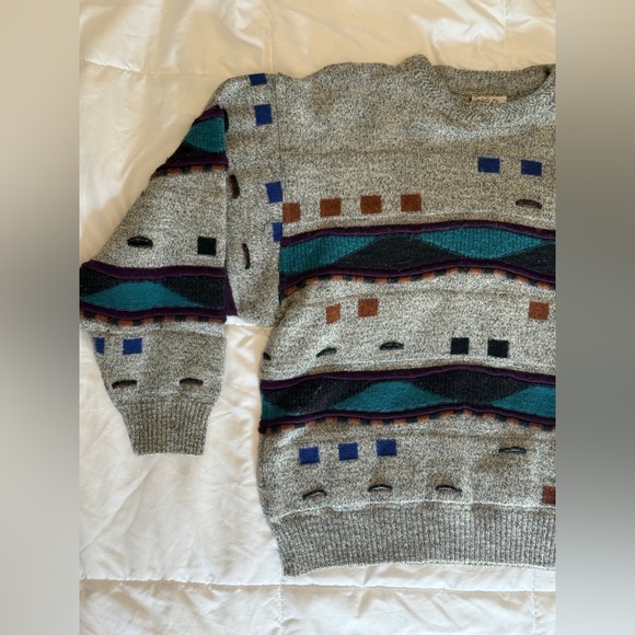 Stay stylish and warm with this multicolor patterned sweater. Featuring a blend of gray, teal, brown, and blue, this sweater is perfect for any casual occasion.