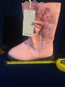 The Dadawen Princess Boots for girls are designed for casual winter wear. These pink boots feature a PU leather upper with charming bow and pearl accents. They have a plush lining for warmth and a rubber outsole with an anti-slip sole for safety. The boots are easy to put on with a zip closure and include lace trim for added style. Suitable for everyday outings or casual gatherings. New with tags, size European 32.