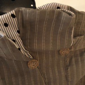 Dagg & Stacey sleeveless dress, Size Medium, in pinstriped sage green with wooden buttons and black-and-white pleated detailing on bodice and skirt. Back zipper and plenty of stretch to fit up to a Size 8/10. Skirt hits at knee.