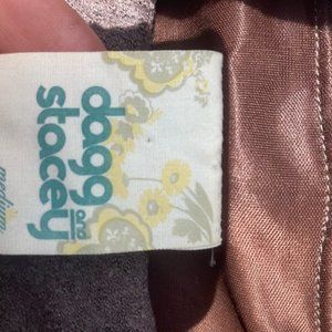 This is a beautiful wool/rayon sweater slash jacket by Dagg and Stacey, a Canadian company that produces limited run womens line collections primarily made from recycled materials and vintage fabrics. Items are designed and made in Toronto. I am sad to see it go but rarely have occasion to wear it and would love it to go to a happy home. Kind of a chocolate/mocha brown. Cowl neck, polyester feeling lining so not itchy. 3/4 sleeves. NB: Medium, but fits a bit more like a small. Pockets are false. Lovely item!