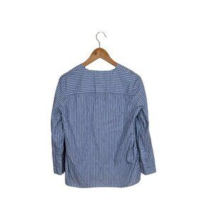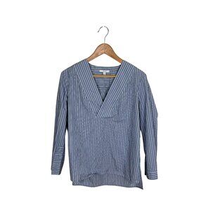 Striped cotton shirt from Dagmar in excellent condition! This classic blue and white pinstripe design features a flattering V-neckline and relaxed fit that works for both professional and casual settings.