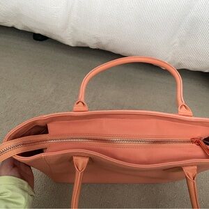 This grapefruit colored tote bag is great for school or work. Very spacious with various compartments for a water bottle , laptop, etc. Very lightly used.