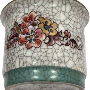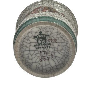 A beautiful small bowl done in a craquelure finish with hand painted floral design. This piece is in very good condition with no damage. The measurements are 2 3/4-inch diameter, 2 1/4-inch high, with a 1/4-inch indent a the base and painted green. The bottom is stamped DJ Copenhagen Denmark 171-507 sighed BR. If you have any questions, please feel free to ask. Thank you.