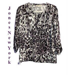New without tags Jones New York Log Sleeve Tee. Size Medium Sport Tee. % Cotton U shape neck cut Cleavage. Multicolored Leopard like print. Beautiful and shiny. I believe this can be worn as casual wear or a night out on the town.