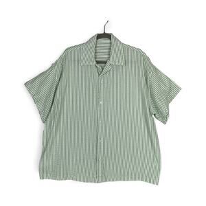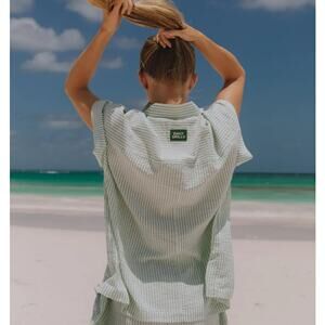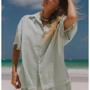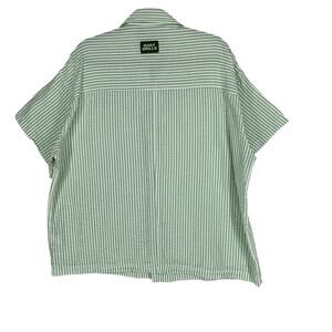 Daily Drills Women Seersucker Boxy Button Up Shirt XS Green White Stripe Coastal