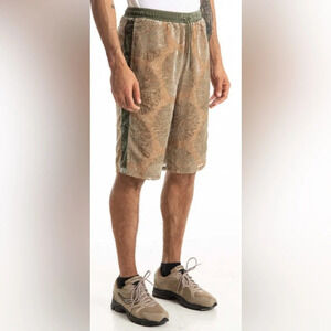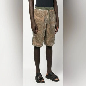 abstract-print bermuda shorts from Daily Paper featuring green, sand beige, abstract pattern print, elasticated drawstring waistband, velvet trim, rear welt pocket and knee-length.