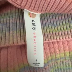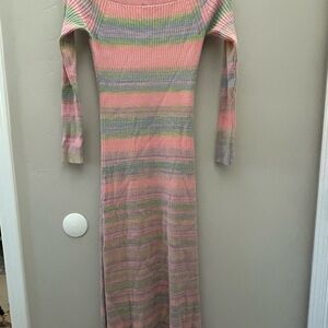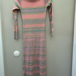 Elegant striped pastel maxi dress featuring a tan belt bag. Perfect for a chic look.