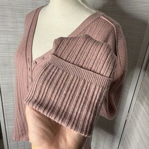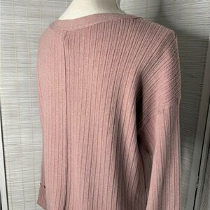 ✨ Daily Practice Anthropologie pink/mauve ribbed knit long sleeve top. Button detail. Stitched/fixed rolled cuff. Soft material. Small repair made on the sleeve, refer to photo. Otherwise, good used condition.
