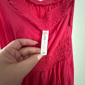 A square neckline with barely there straps, pockets, and a ruffled high-low hem make this midi quite mighty.