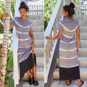Embrace effortless style with the Daily Practice by Anthropologie Tie Dye Maxi Dress, a perfect blend of comfort and fashion. Designed with a bohemian spirit, with a tide dye pattern in a soothing gray hue, complemented by a flattering crew neckline and short sleeves. The lightweight, woven cotton fabric ensures breathability and ease of movement, making it ideal for casual outings and travel adventures. this maxi dress is a versatile addition to your wardrobe, promising to keep you stylish and comfortable throughout the sunny season.
