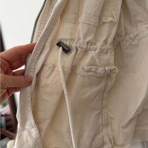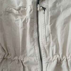 Beige utility jacket with front zipper. Includes several pockets and cinched waist. Perfect for everyday use.