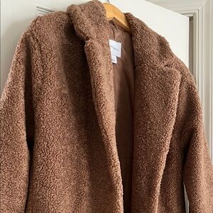 Cozy teddy jacket with a plush feel. Perfect for chilly days. Stylish and comfortable.