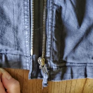 like new daily ritual cargo jacket. a washed black color, in a light weight demin like fabric. plenty of pockets. has a waait string on inside to cinch jacket in for a more fitted look. zipper closure. all snaps and zippers work perfectly. size 4