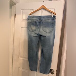 Ankle length hem with faded wash and medium rise. Excellent condition. No distressing or holes so great for office or casual Friday.