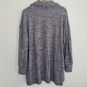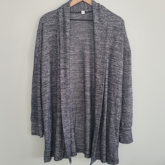 Length Cozy gray cardigan. Open-front design. Perfect for layering.