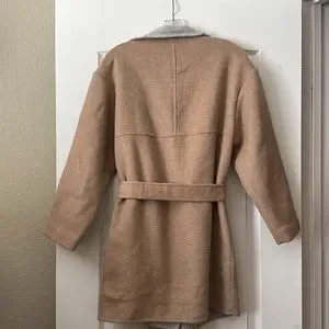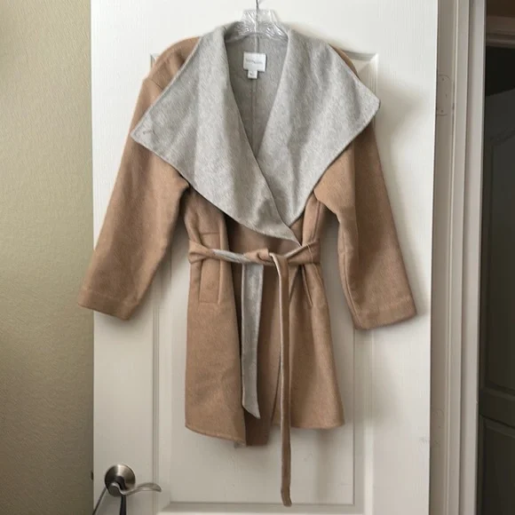 Tan and grey. Side pockets. One button closure. Removable two toned belt. Measures 34 inches long and 18 inches across from armpit to armpit when flat and buttoned. Only worn once, excellent condition